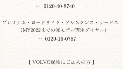 ボルボ・カー水戸のホームページをご覧いただき誠にありがとうございます。 年末年始休業日 / 緊急連絡のご案内です。────────────────────────────────────────12/29(月) ~ 1/6(火) まで冬季休業日とさせていただきます。1/7(水)10:00より通常営...